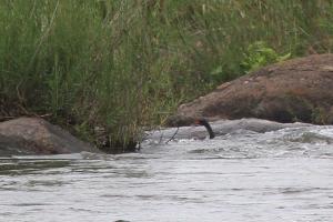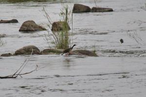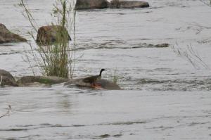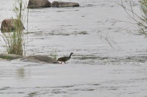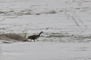 There was some water flowing on the south side of the Sabie River as we crossed the bridge. We stop, looking up and downstream to see what birds are about. As we are doing this one of us jokingly said keep an eye out for Finfoot, and with that Sally looks downstream and says “There it is”. It was quite a way down but walking in and out of the water at the upper end of some rapids.