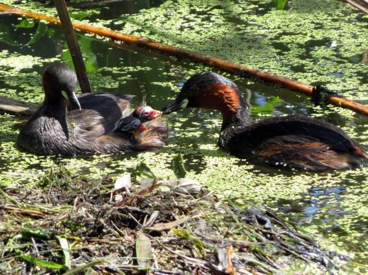 Little Grebes and their chicks piggy-backing