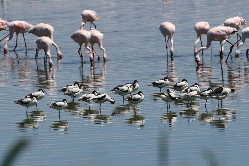 Next we headed for Pan 4 and the birding stand. Greater and Lesser Flamingos everywhere to be seen. Magnificent sight of numbers and colour. While on the stand we notice three Bar-tailed Godwits among the Flamingos.