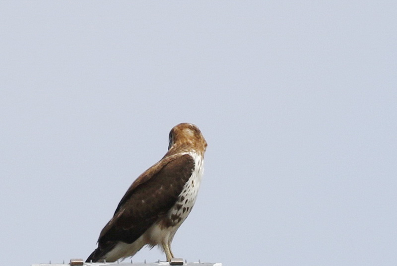 As we chatted one of them – the wife – said “What’s that bird on the pole?” on the path to our right going in the direction of the blue-roofed school. Sure enough it was back and it allowed us to get several grey sky shots before it flew.