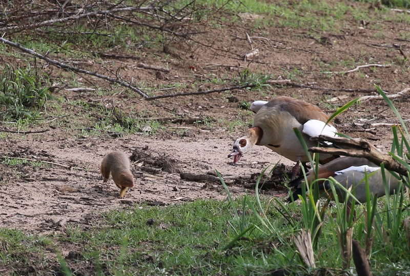 A Slender Mongoose had a playful time with a pair of Egyptian Geese – running up to the Geese and being chased back. It was hilarious to watch.