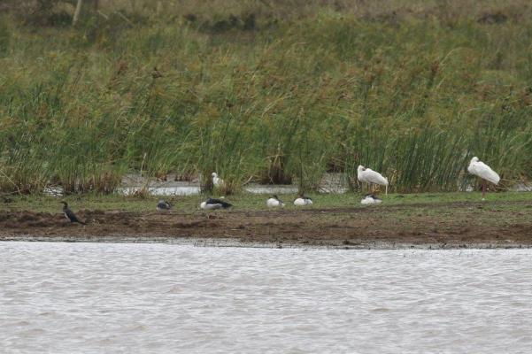 Comb Ducks, African Spoonbills, Little Egret and White-breasted Cormorant