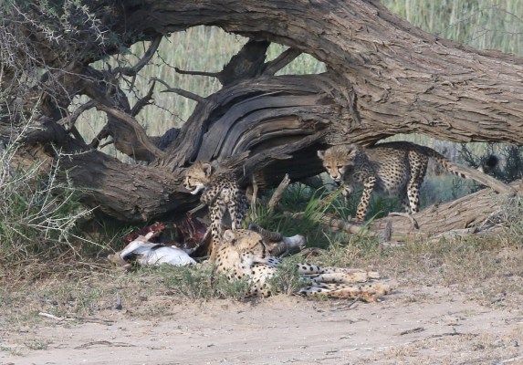 Cheetah and cubs on kill