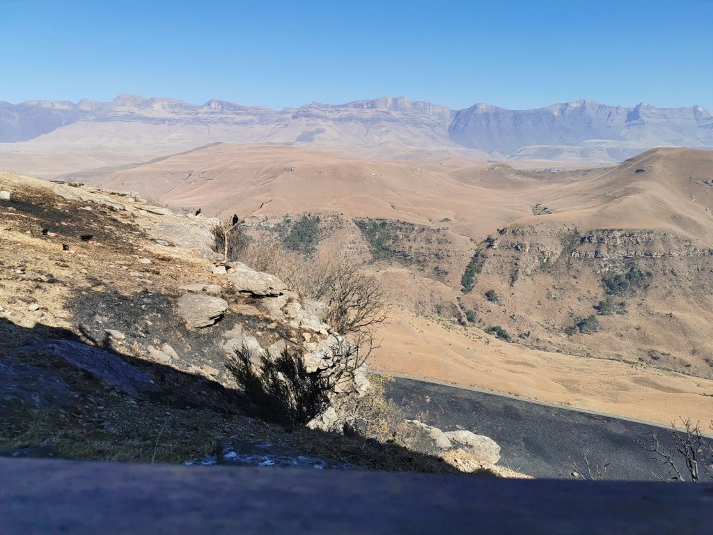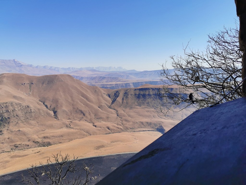 As we approached the caves a parks official greeted us and asked if we had come to see the caves. As we had not booked we said “no” – however she was kind enough to let us pass around the caves to the descent on the other side of the mountain. The caves were briefly visible as we went through and the San Bushmen let me take a quick photo.