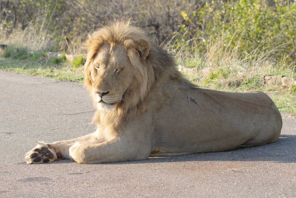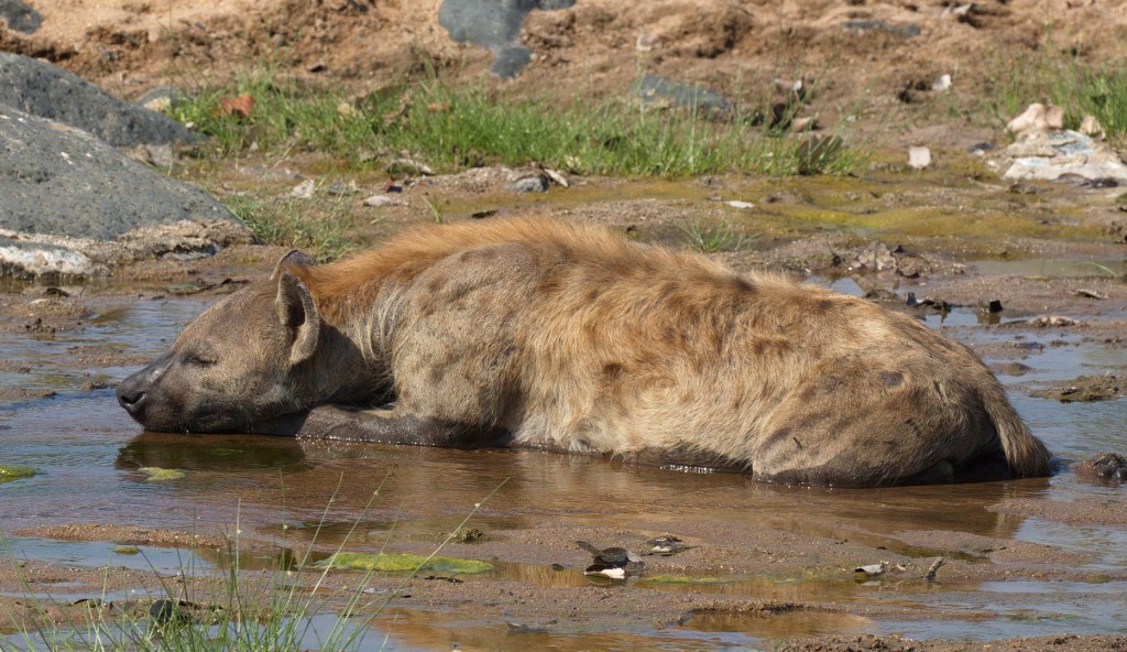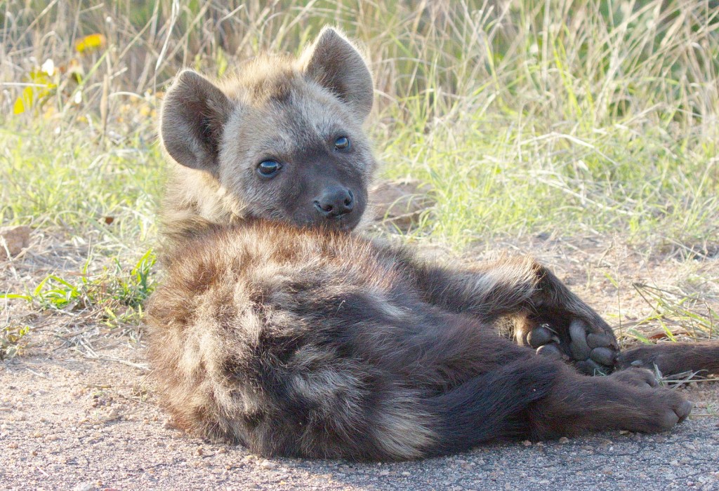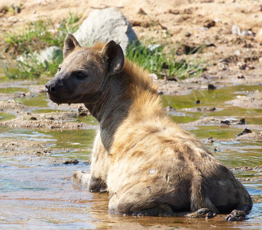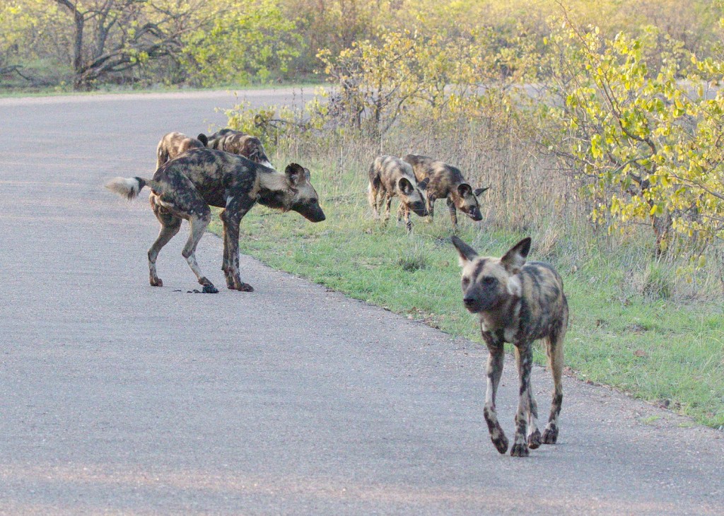 The H14 at that time provided us with some interesting memories. At separate places – quite close to each other – there were Hyenas – mainly curious pups. Very cute looking and very inquisitive – even inspecting the underside of our car. Further along seven Wild Dogs appeared on the road and the leader took them alongside our car on their way to somewhere. Then there was a Grand-daddy of a Lion imperiously lying on the road daring anyone to pass. After that we took a loop down next to some water and there in the water were Hyenas having a relaxing bath. On the way back another pair of Lions were seen in the foliage by the road sleeping off a wild night by the looks of them – well zonked out.