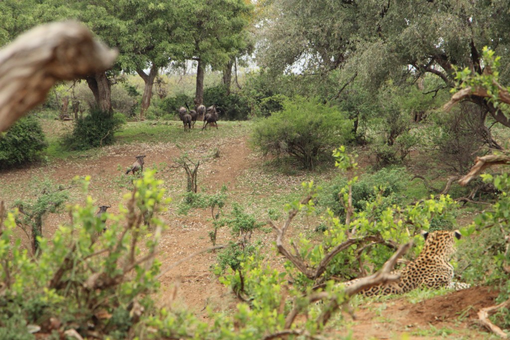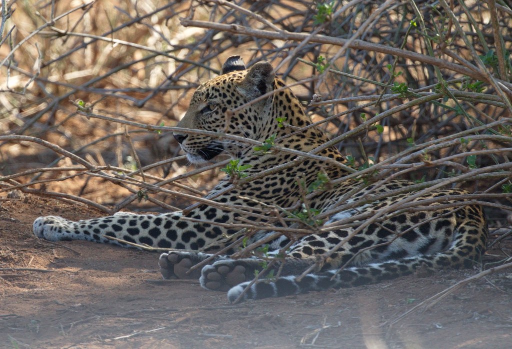 And then there was the Leopard lying next to the road among some dead tree trunks. At first we passed by without noticing it but something caught our eye. We reversed and there was the Leopard – keeping an occasional eye on the nearby Buffalo.