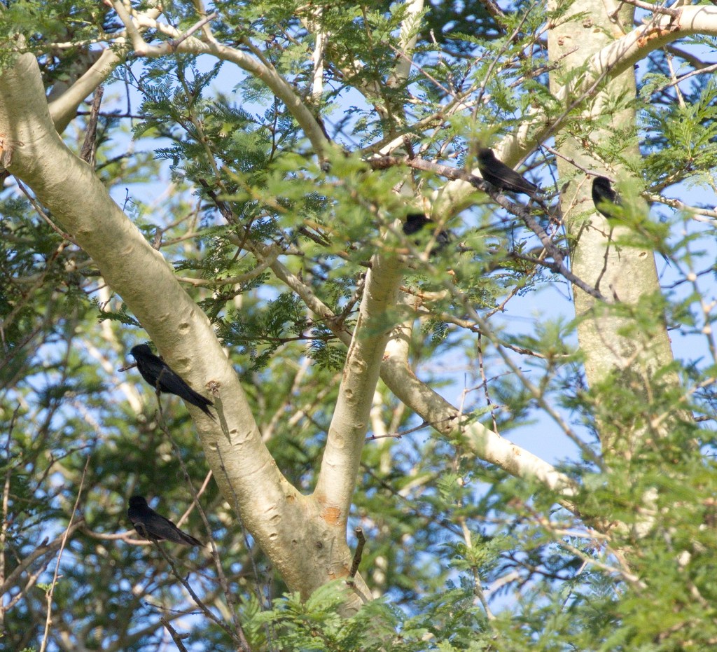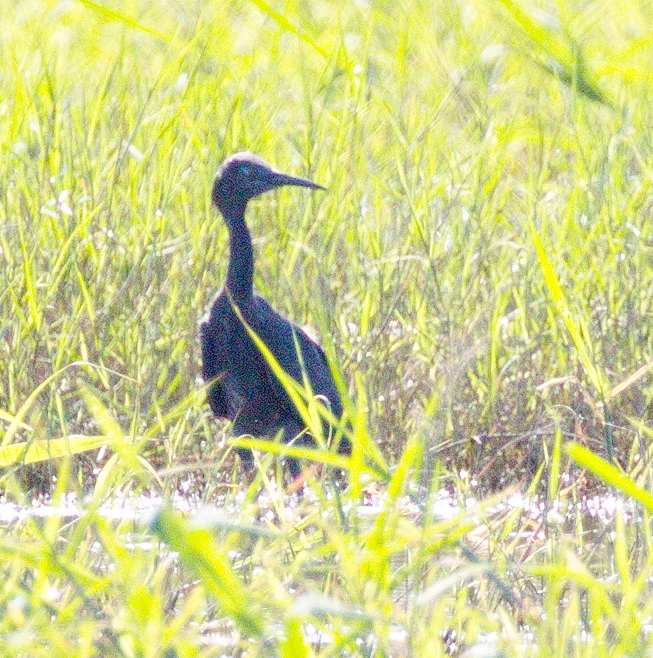 On the right of the wetland we noticed Collared Pratincoles on the ground and Glossy Ibis as well, even a beautiful Malachite Kingfisher. And it was there that a Large black waterbird was seen. We approached to get a better look but it flew then a little later it came back to the same spot. At first we had considered it to be a Rufous-bellied Heron, but now that we were closer we realised that it was a Black Heron. Again it flew and returned. As it flew we could see the yellow feet and black bill. On return it was disturbed by a Purple Heron and flew away with yet another Black Heron – a pair.