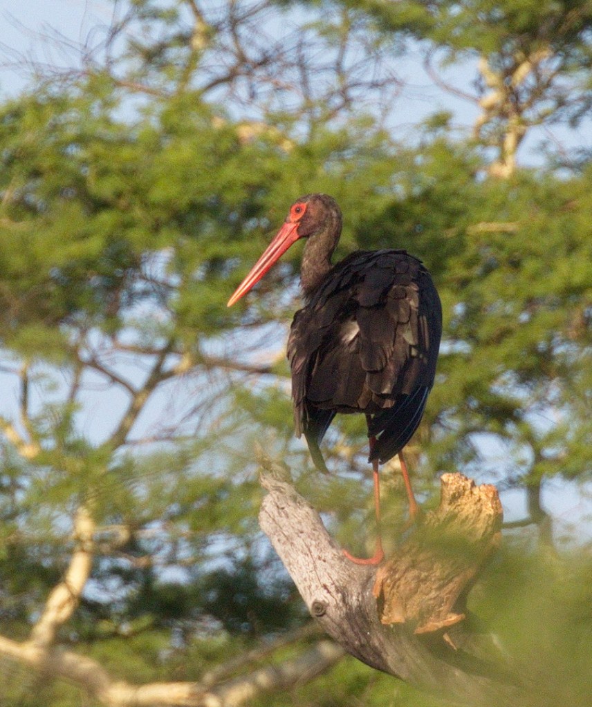 The next day we took a trip towards the Hunting camp, took in the Loop Road and also to the hides on Nsumo Pan, the Campsite and Malibala Hide. As we left the tar road heading towards the Hunting camp , we saw a large bird in one of the fever trees. On closer inspection we were surprised to see a Black Stork.