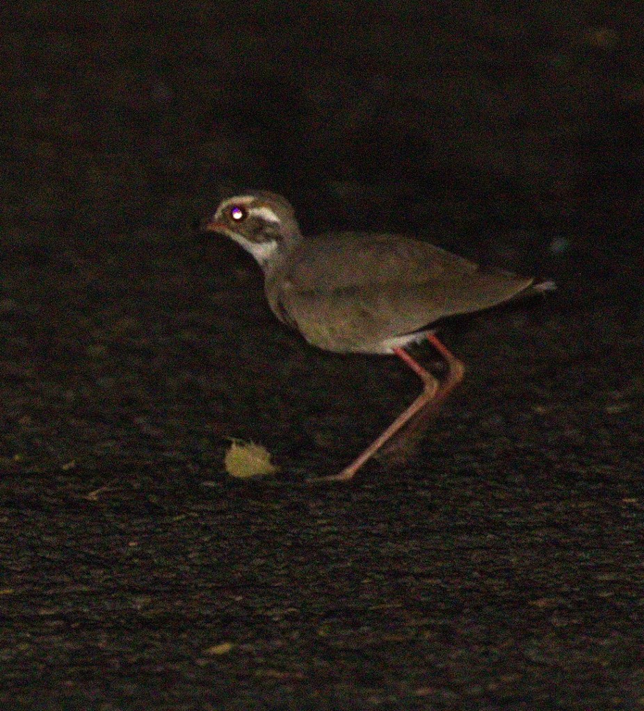 We stayed at the hide until nightfall only leaving there close to 18h30. (Had to be back in camp by 19h00). When we hit the tar road back to camp we went left instead of right and trolled that road as far as the Tower. On the way we saw a number of Fiery-necked Nightjars and a Spotted Thick-knee. On the way back I managed to get a shot of a Fiery-necked Nightjar and also the Bronze-winged Courser – both in the middle of the road.