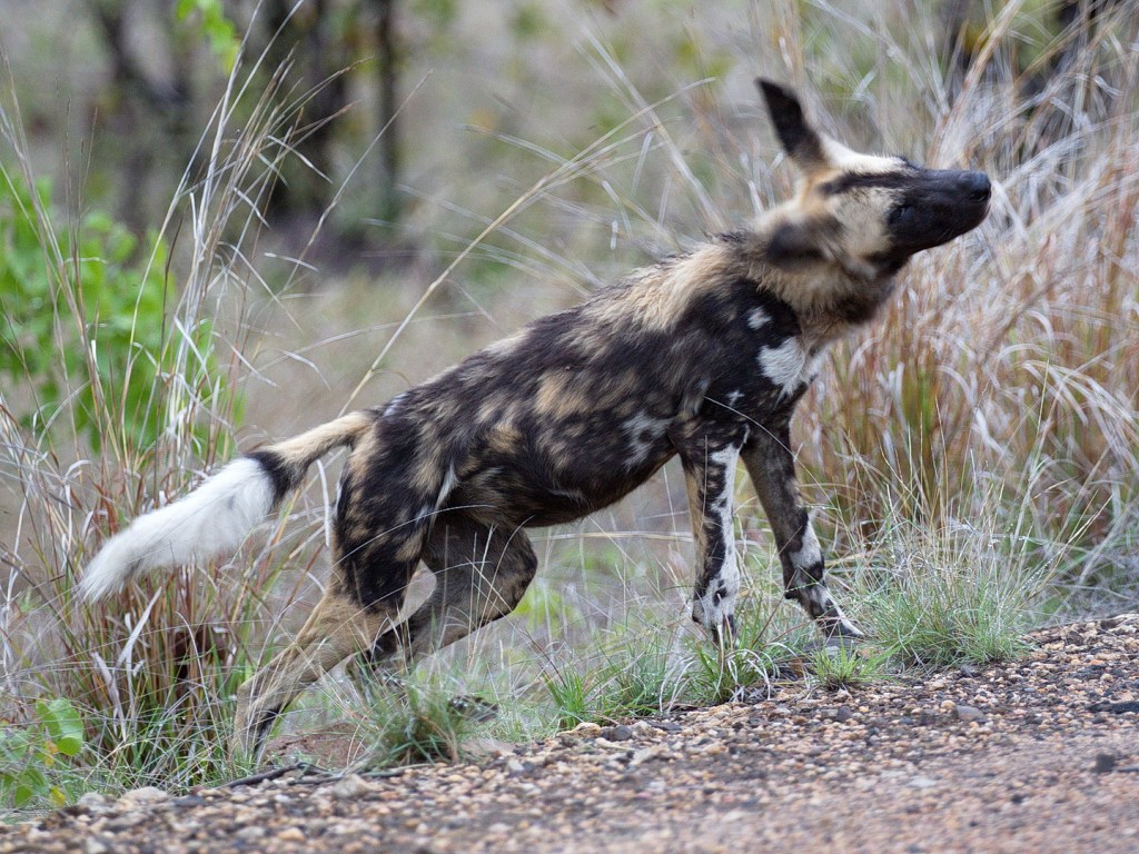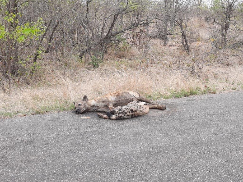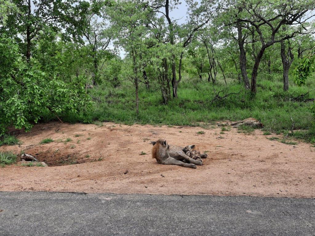 One day as we drove out of Skukuza heading south, we had not gone far when we came across Hyenas including youngsters by the road. Usually they sit around but this lot were different.