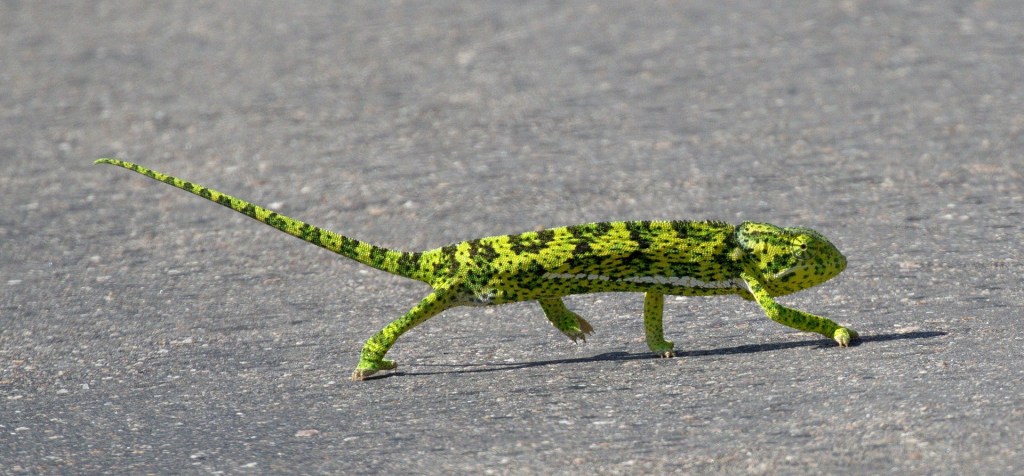 Probably one of our favourite sightings in the Kruger was this Chamelion crossing the road in its unique way – “one foot forward, shake it too and fro in a jerky motion then put it down” Repeat this with each leg until you are eventually across. One eye looking up the other looking all around etc. (Tap on photo to enlarge it).