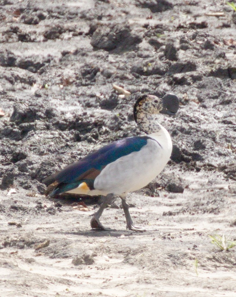 On the way there was a dam by the road with some water in it. On the mud bank we noticed Knob-billed Ducks displaying a variety of colours.