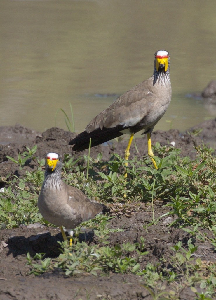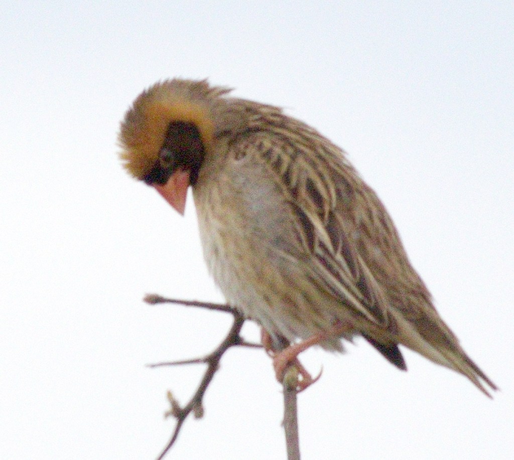 In the trees above Tasha and Dick’s campsite a lovely pair of birds were courting – not Lovebirds but very colourful. Female and male Red-headed Weavers.