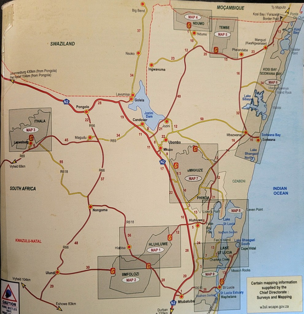 It is a short 300 metre drive to get inside the park. However, the entrance gate is a further 3 kilometres away. So, as you exit to the right from the campsite turnoff, you are on a main road running through the Park – the road from Mtubatuba to Nongoma.