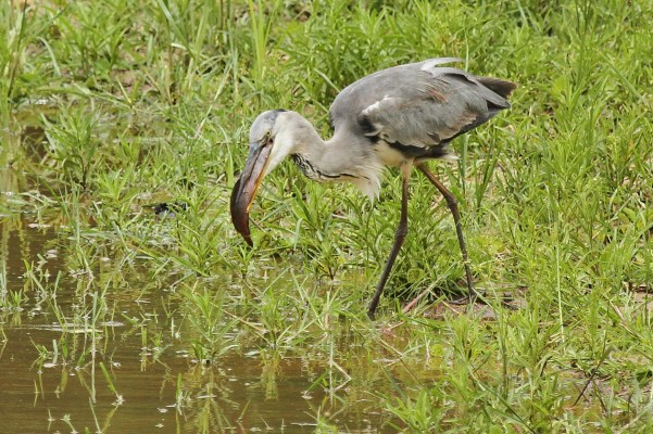 Grey Heron with full crop of catfish, Bonamanzi