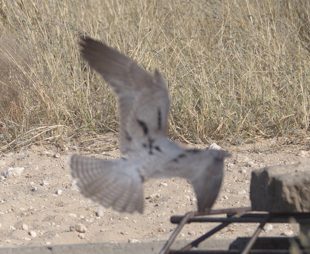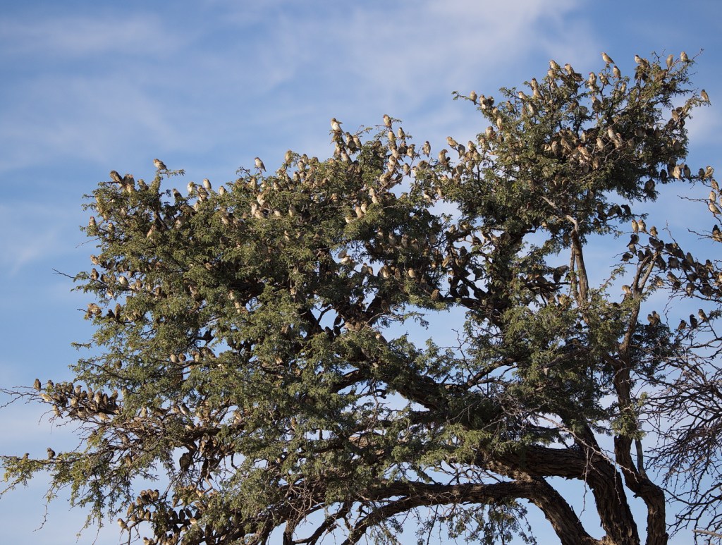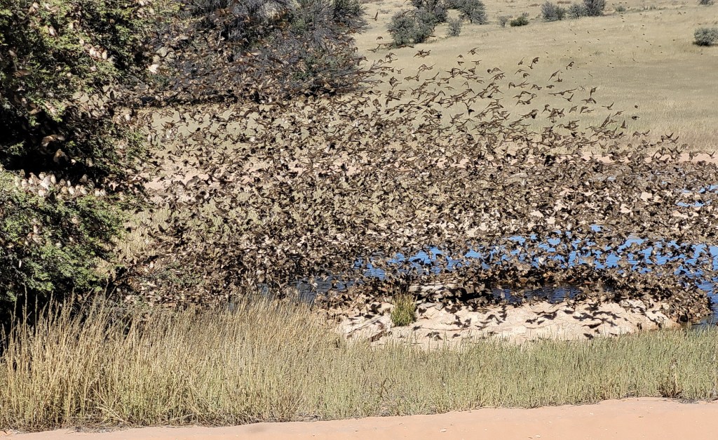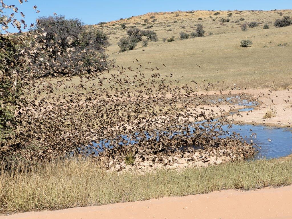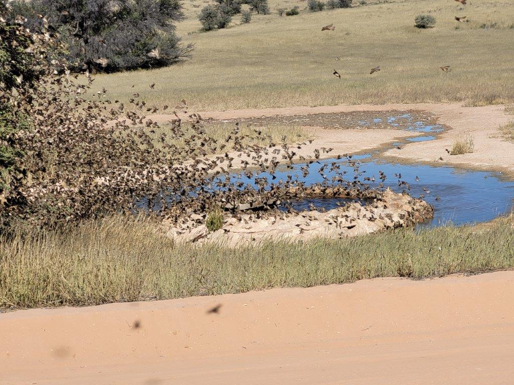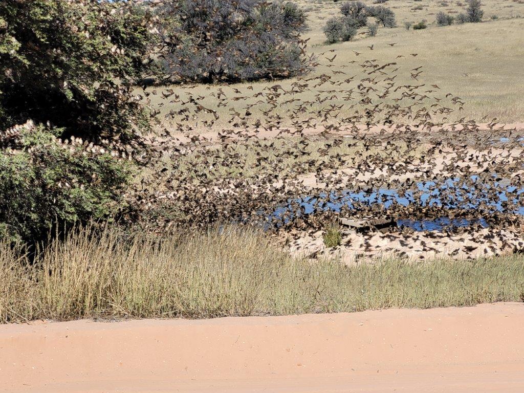 Between the Camp and Kamqua Picnic site (60 kms) there are three short loop roads. This drive follows the dry Auob riverbed. There are small waterholes along each of these loops which attract many small birds – in particular Red-billed Quelea as well as Sandgrouse. Of course, raptors are there to feast – especially Lanner Falcons and Gabar Goshawks. It is fascinating to watch the raptor antics as they try to catch a meal.