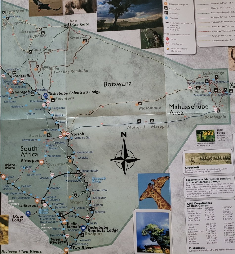 Our program was 3 nights in Rooiputs (Botswana), 3 nights in Mata Mata (RSA), 5 nights in Nossob (RSA), 6 nights in Polentswa (Botswana) and 3 nights in Twee Rivieren (RSA).
