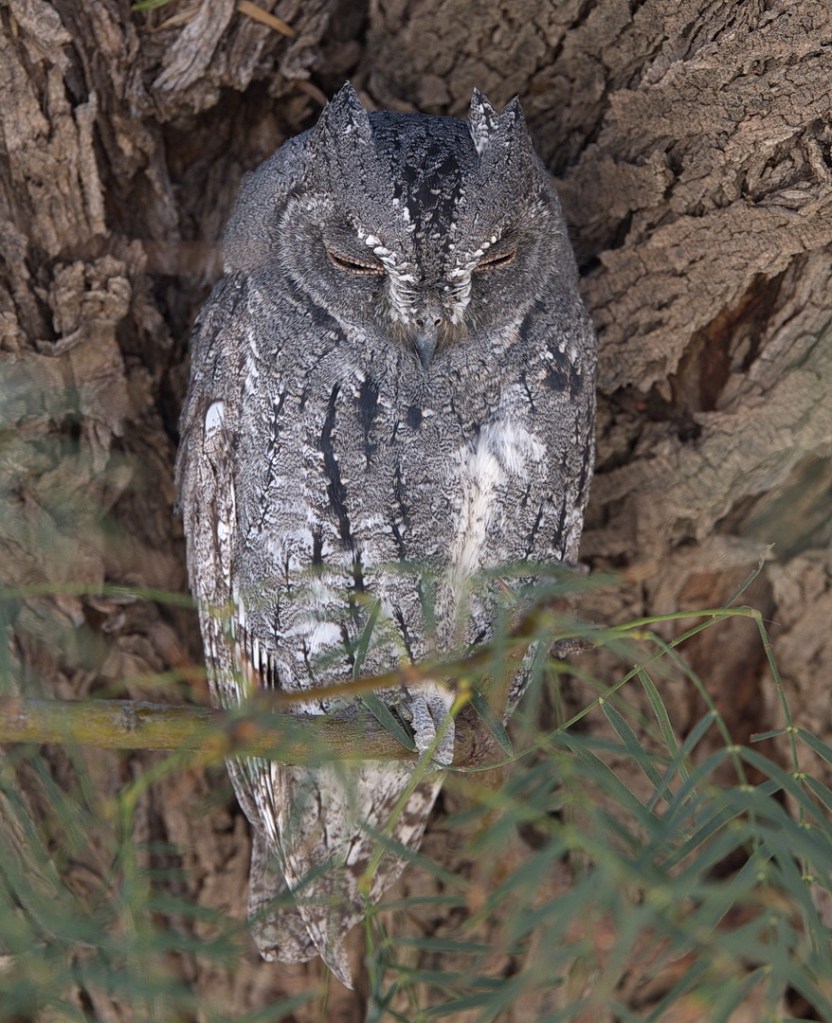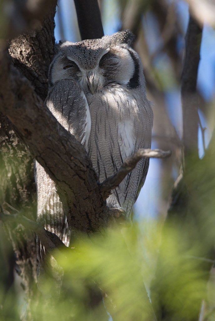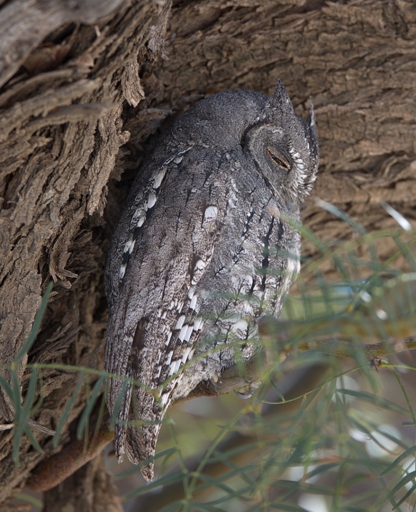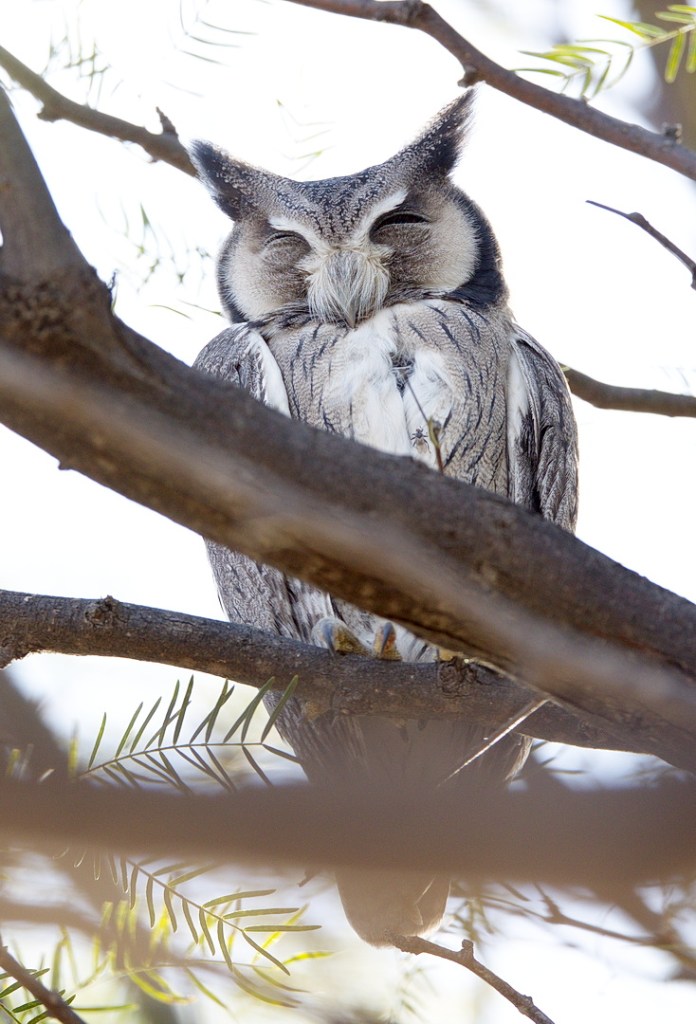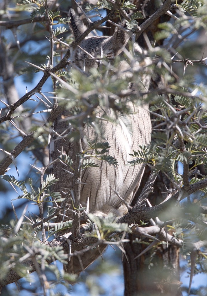 There is a set of thorn trees immediately after a small waterhole (on the right) not far back towards the main gate from Rooiputs. Over the course of the three weeks that we were in the park we always saw 5 White-faced Owls well hidden in that set of trees. They were not only hard to find but they were almost impossible to photograph.