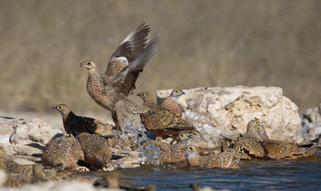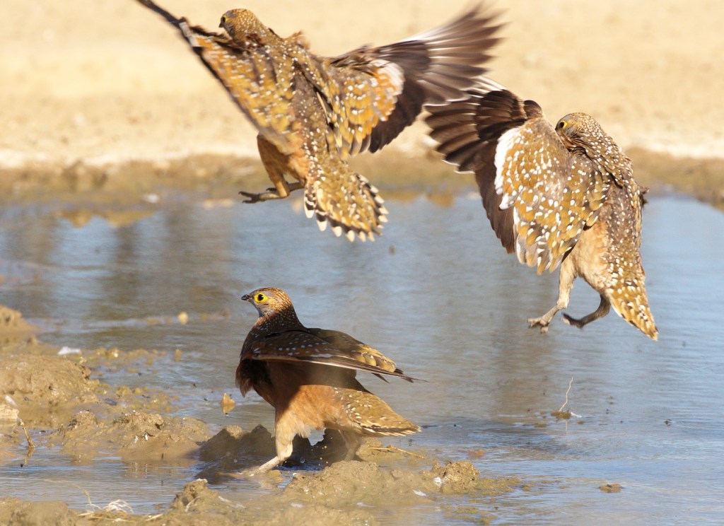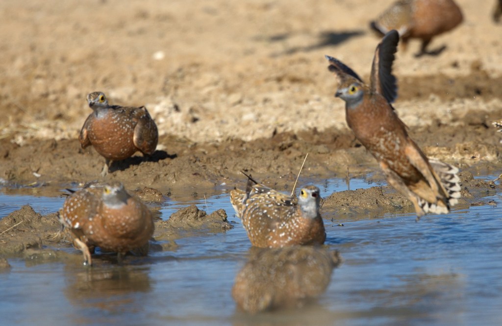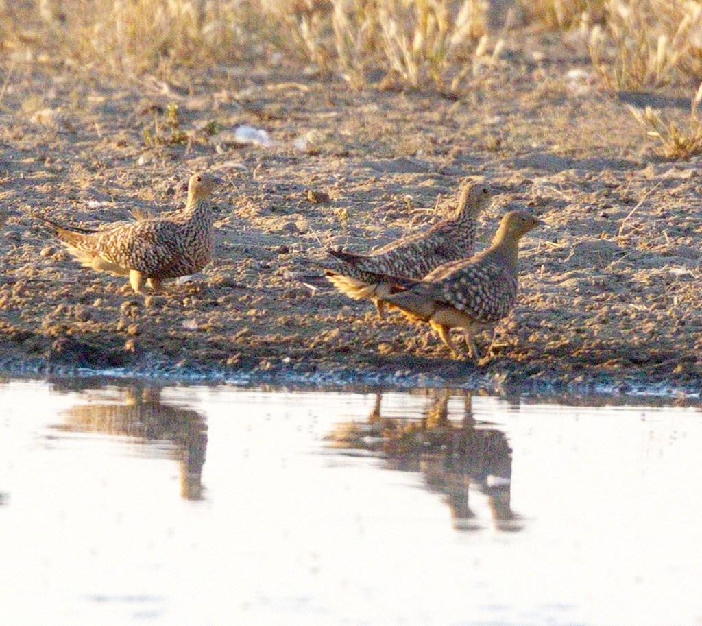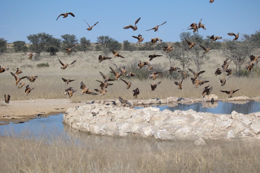The Burchell’s Sandgrouse were the predominant Sandgrouse that we observed at waterholes. They could be heard and seen swirling around above then take a dive for the waterhole only for one to decide to head back into the sky and they all followed. Once at the waterhole they did not stay long and any nervousness sent them all back into the air. Their antics were fun to watch – especially when the raptors were about.