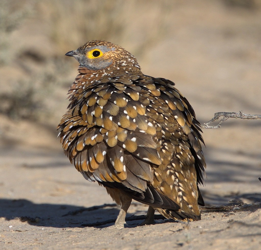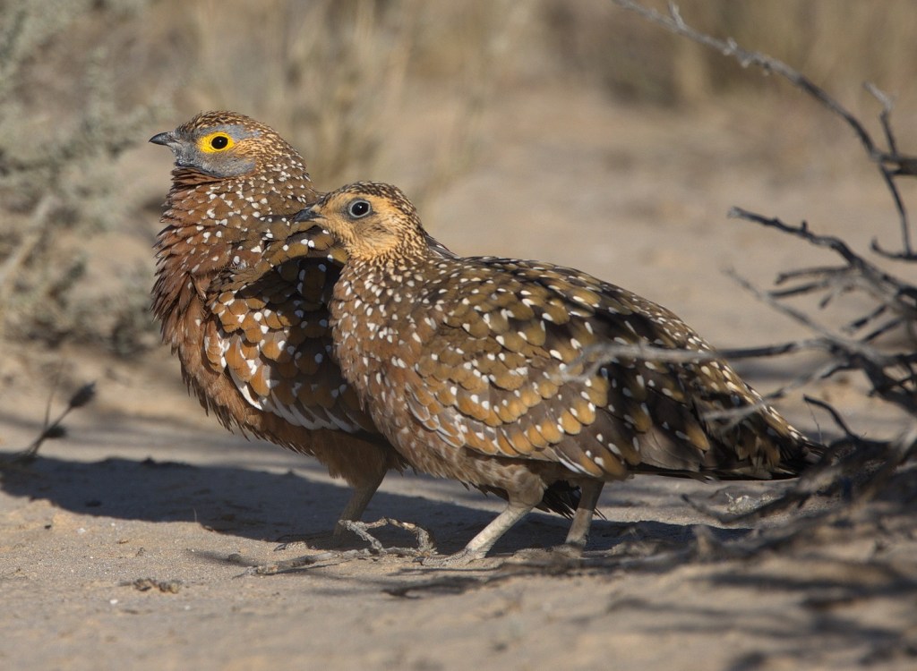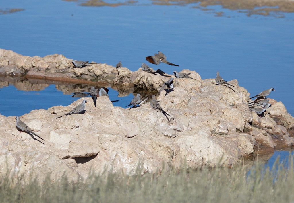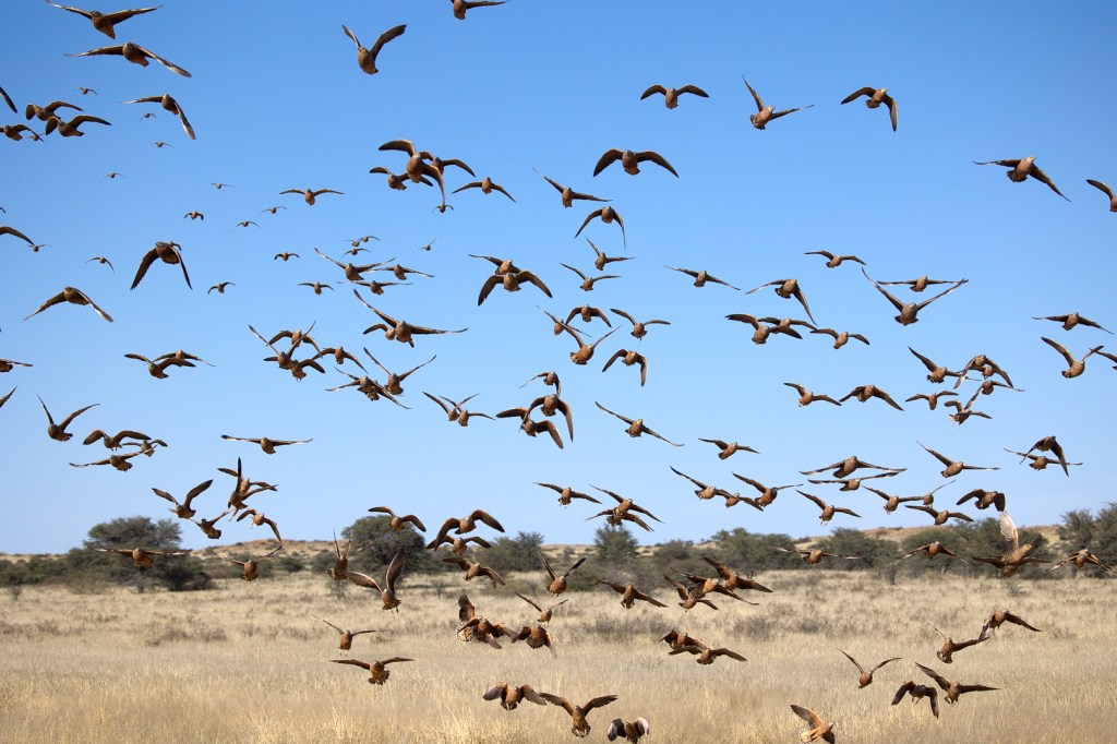 The Burchell’s Sandgrouse were the predominant Sandgrouse that we observed at waterholes. They could be heard and seen swirling around above then take a dive for the waterhole only for one to decide to head back into the sky and they all followed. Once at the waterhole they did not stay long and any nervousness sent them all back into the air. Their antics were fun to watch – especially when the raptors were about.
