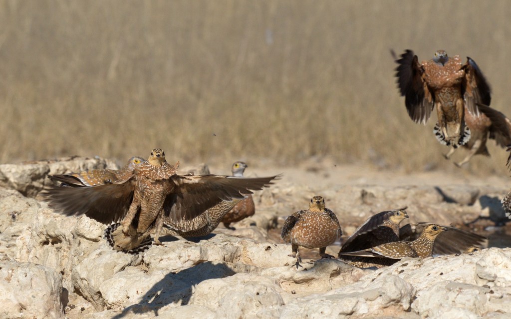 Once landed it is a case of absorbing as much water under their breasts and wings to take back for their young. A sip or two for themselves and then they were off. Ever watchful for marauding Lanners and Goshawks.